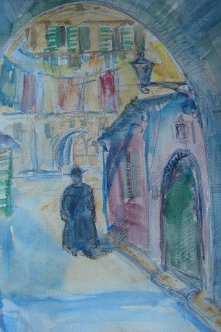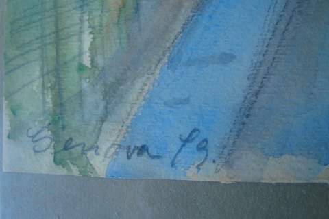Text available in Danish: Akvarel af Aksel Lundgreen - Parti fra Genova, Italien 1949.