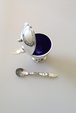 Georg Jensen Cactus Sterling Silver Mustard Pot No 629. Measures 7,5cm x 7,5cm. In good condition, but has a tiny chip on the blue enamel and rust on the spoons steel part.