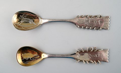 2 Sami/Lapps spoons in silver. Motif of moose and man in national costume.