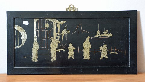 Orientalsk sortlak motiv på træplade og med gylden metalfigurer. Brugsspor på ramme og motiv. Pæn stand.
