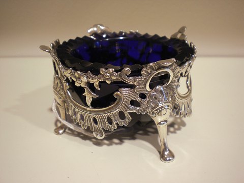 Text available in Danish: Stort fransk saltkar med blåt glas med takket kant i en sølv med stempel men ikke så læseligt. Sølvvægt: 58,4 gram. Monteringern er i rokokko stil. Fra ca. 1870. Højde: 5,5 cm - diameter: 8,8 cm.