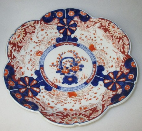 Large Japanese Imari dish, 19th century. Bluish underglaze red and blue enamel colors. Decorated with particular flowers and cranes. On the underside - decorations. Dia .: 31 cm.