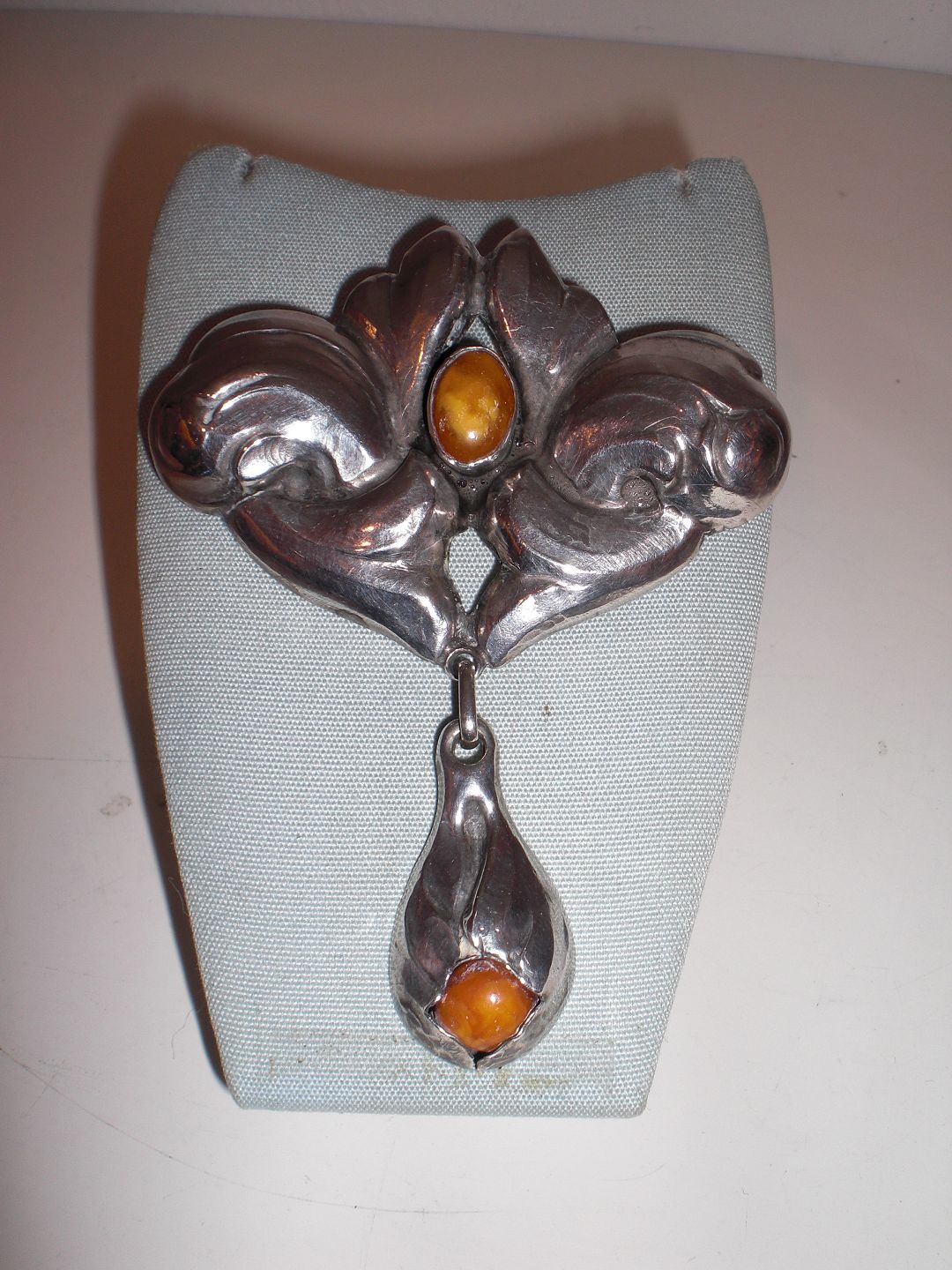 Text available in Danish: Dobbelt skønvirkebroche i 830 sølv med to cabochonslebne ravstykker (mælkerav) udført af E.L.Weiman,Kbh. (1897 - 1937) ca. 1920. Højde: 7,8 cm. - bredde: 6,3 cm.
