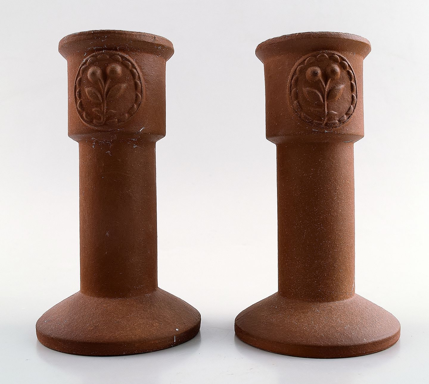 Gustavsberg. A pair of unglazed candlesticks in stoneware.