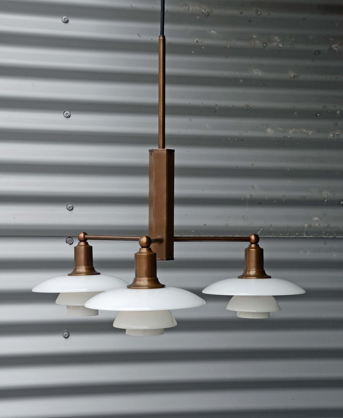 Loftslampe i bruneret messing med tre opalhvide glasskærme.