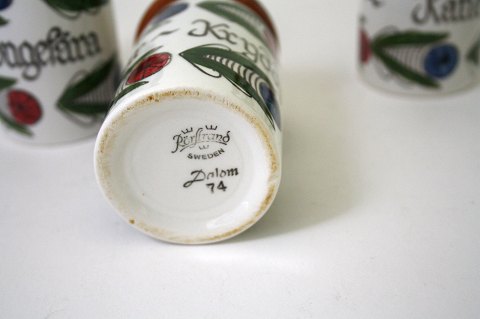 Rørstrand, Dalom fajance, krydderikrukker. Højde 9,5 cm. Diameter 5,5 cm. Pris: 100 kr. pr. stk.
