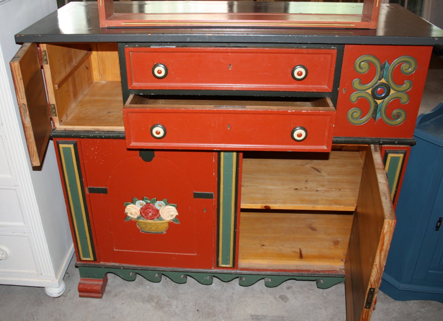 Almuemalet buffet i egetræ. Længde 1,39 cm. Dybde 58 cm. Højde 1,17 cm. Foroven 2 skuffer og 2 sideskabe. Forneden 2 skabe med hylder. Øverste del kan tages af. Pris: 2500 kr.
