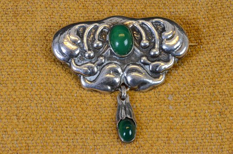 Brooch Art Nouveau in organic pattern of silver with a pearl of green agate in the center of the brooch and at the tip of the pendant. Stamped 830. Art No. 4