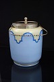 Blå/råhvid glas kagekrukke med blomster. Låget er fremstillet i sølvbelagt metal.