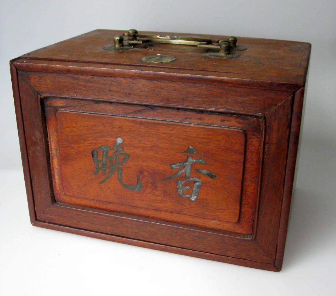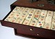 Kineisk mahjong spil, 19. årh. I æske af ædelt træ med beslag og håndtag i messing. Indeholdende 5 skuffer med brikker af ben pålimet bambus. Hver brik med tegn og tal. H.: 17 cm. L.: 24 cm. D.: 16,5 cm.