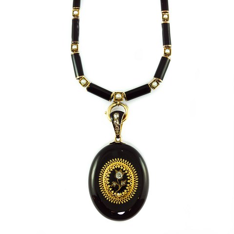 Halssmykke af 14 kt. guld med emalje, diamanter og perler