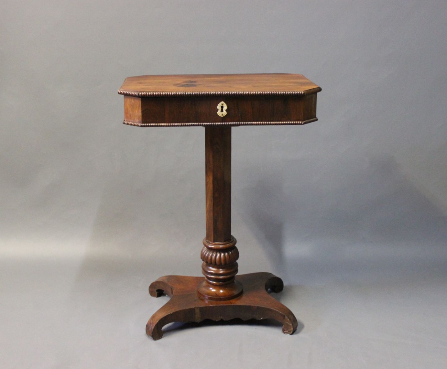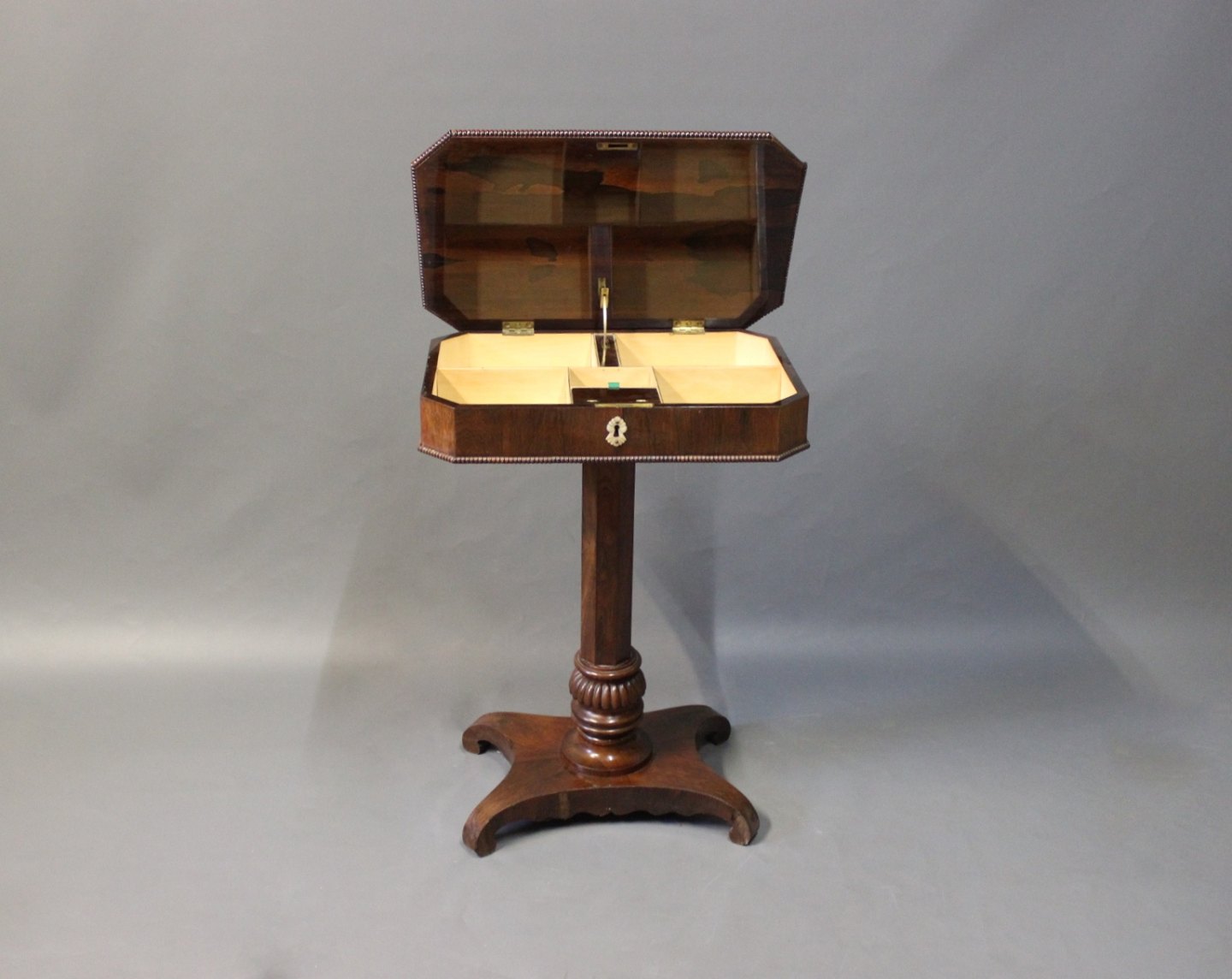 Small antique sewing/Work table in rosewood with turning function and delicate details. The table appears with some patina and from between 1840 and 1860.