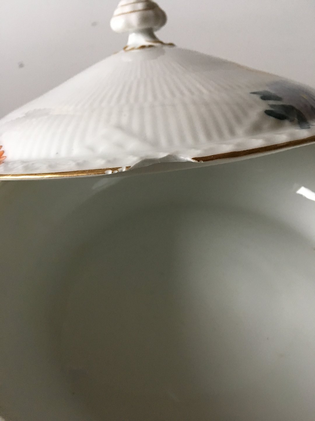 Royal Copenhagen No 93 White Half Lace w. Flowers and Gold Lidded Serving Dish. 20 cm dia (7 7/8"), 6 cm H (2 23/64"). The lid has a large chip, look at picture. There is some wear to the gold. Rare dinner service dated 1894-1898.