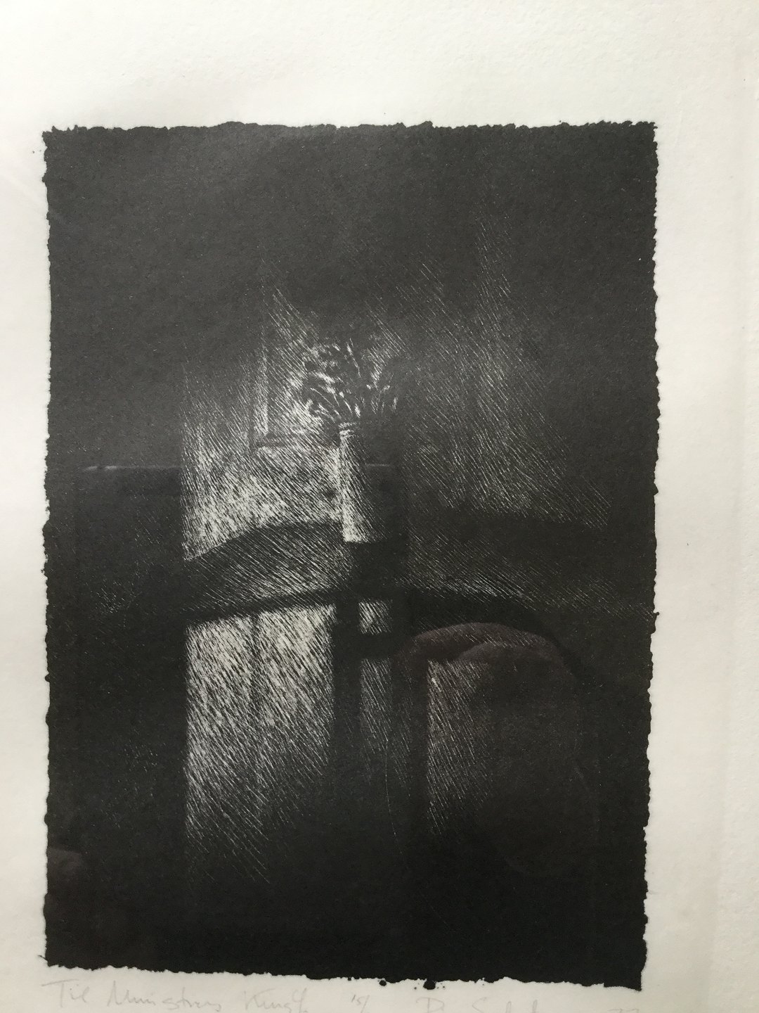 Litografi af Pia Schutzmann - Vase på bord 1977.