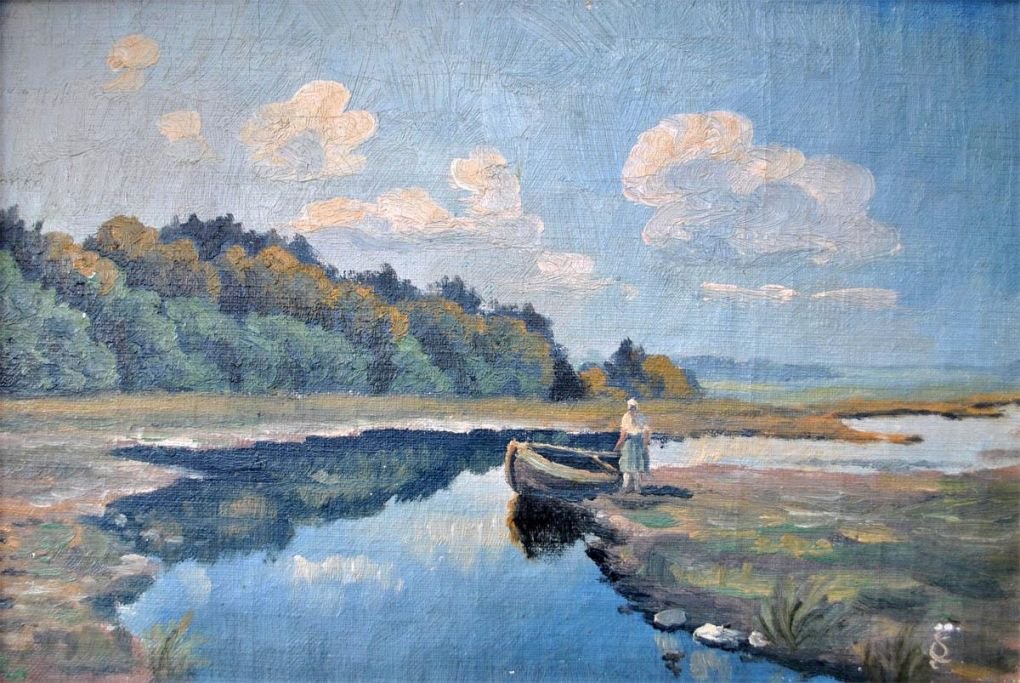 Christensen, Søren (1858 - 1937) Danmark: Kvinde ved å. Olie på lærred. Signeret.: Monogram. 32 x 42 cm.