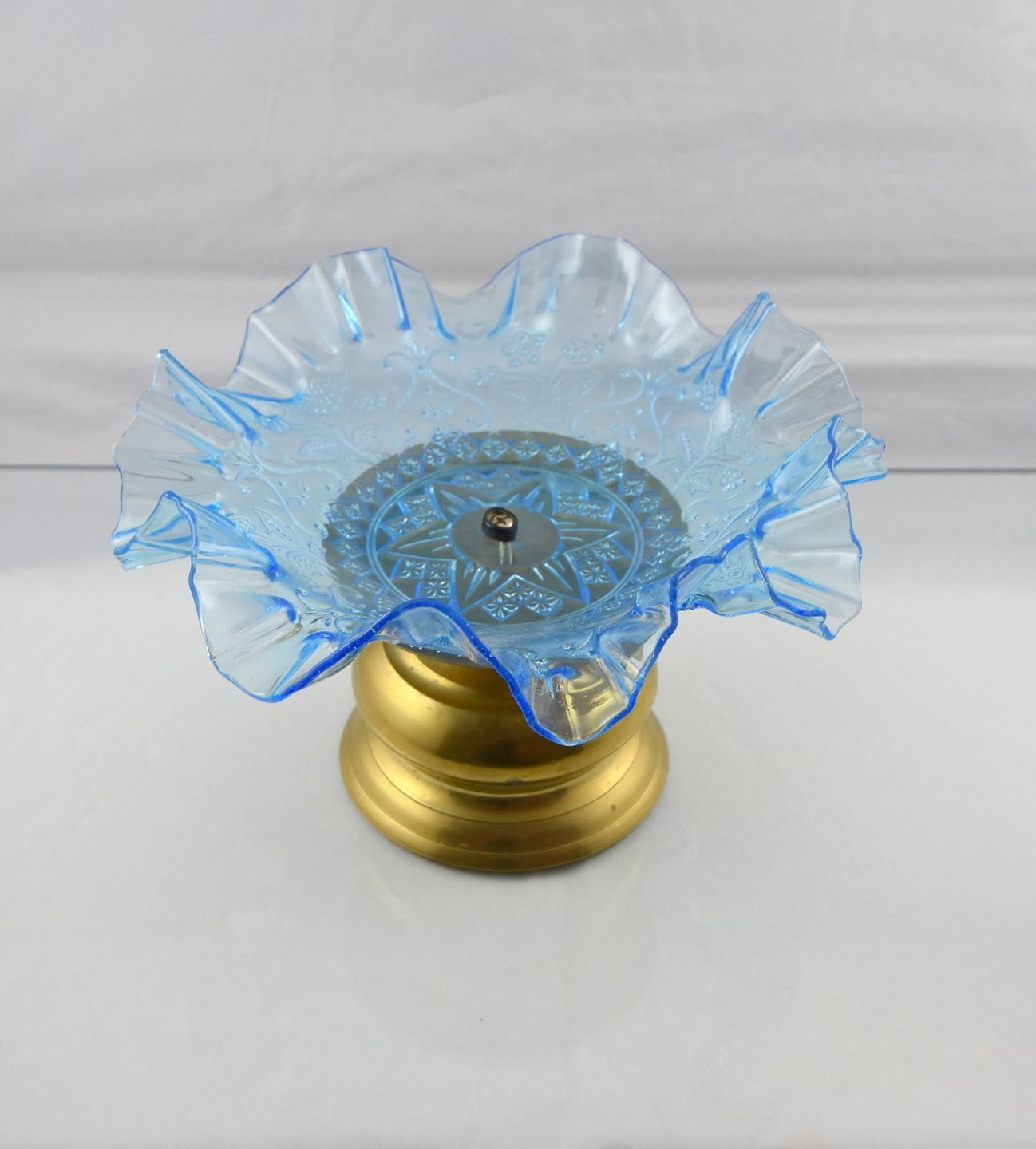 Blå gennemsigtig glasopsats med blondekant og messing fod