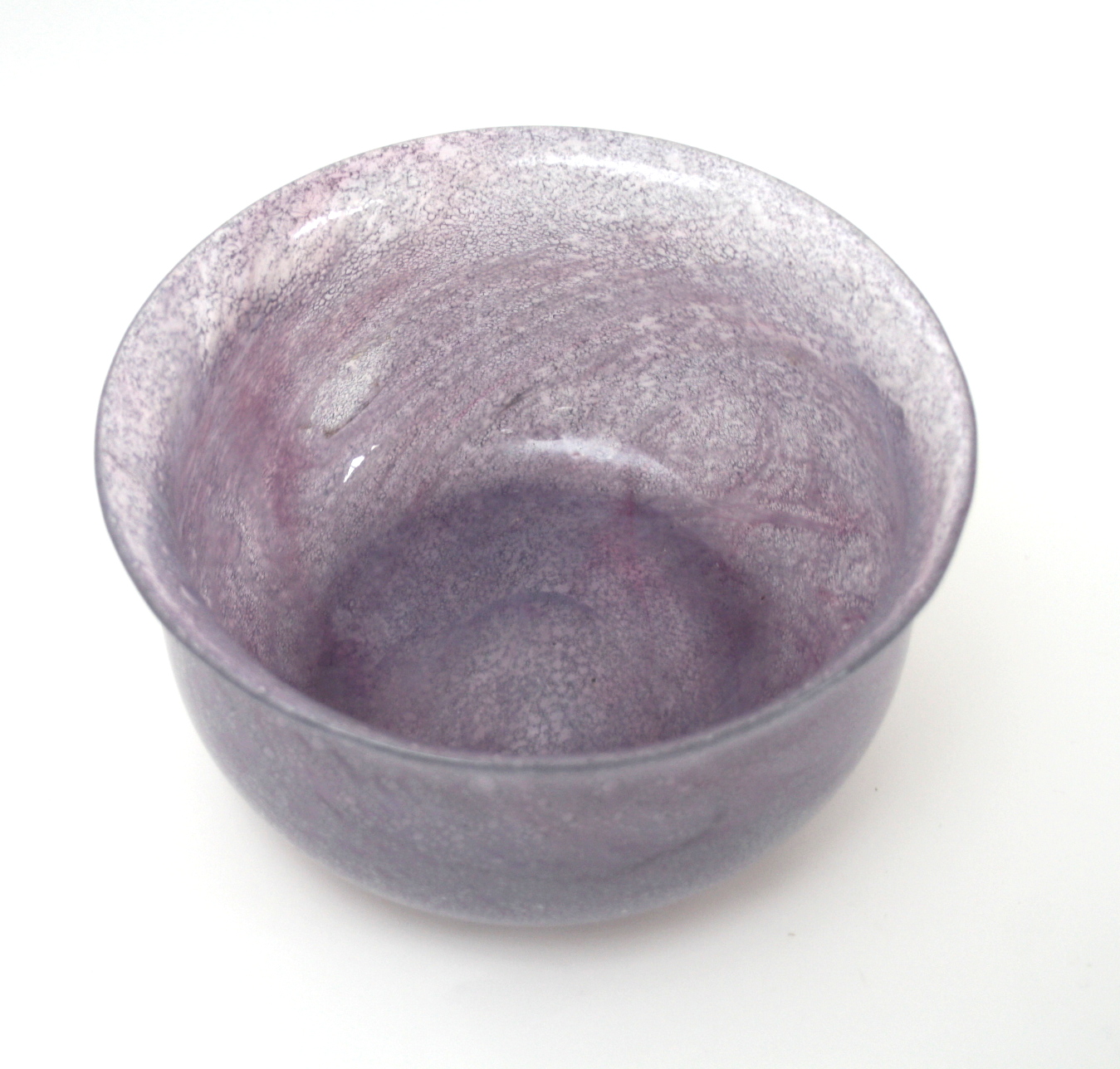 Holmegaard, syrenfarvet skål i troldeglas designet af Sidse Werner i 1975. Højde 10,5 cm. Diameter 20 cm. II. sortering luftbobbel indvendig der er bristet, den lyse plet på billedet. Pris: 275 kr.