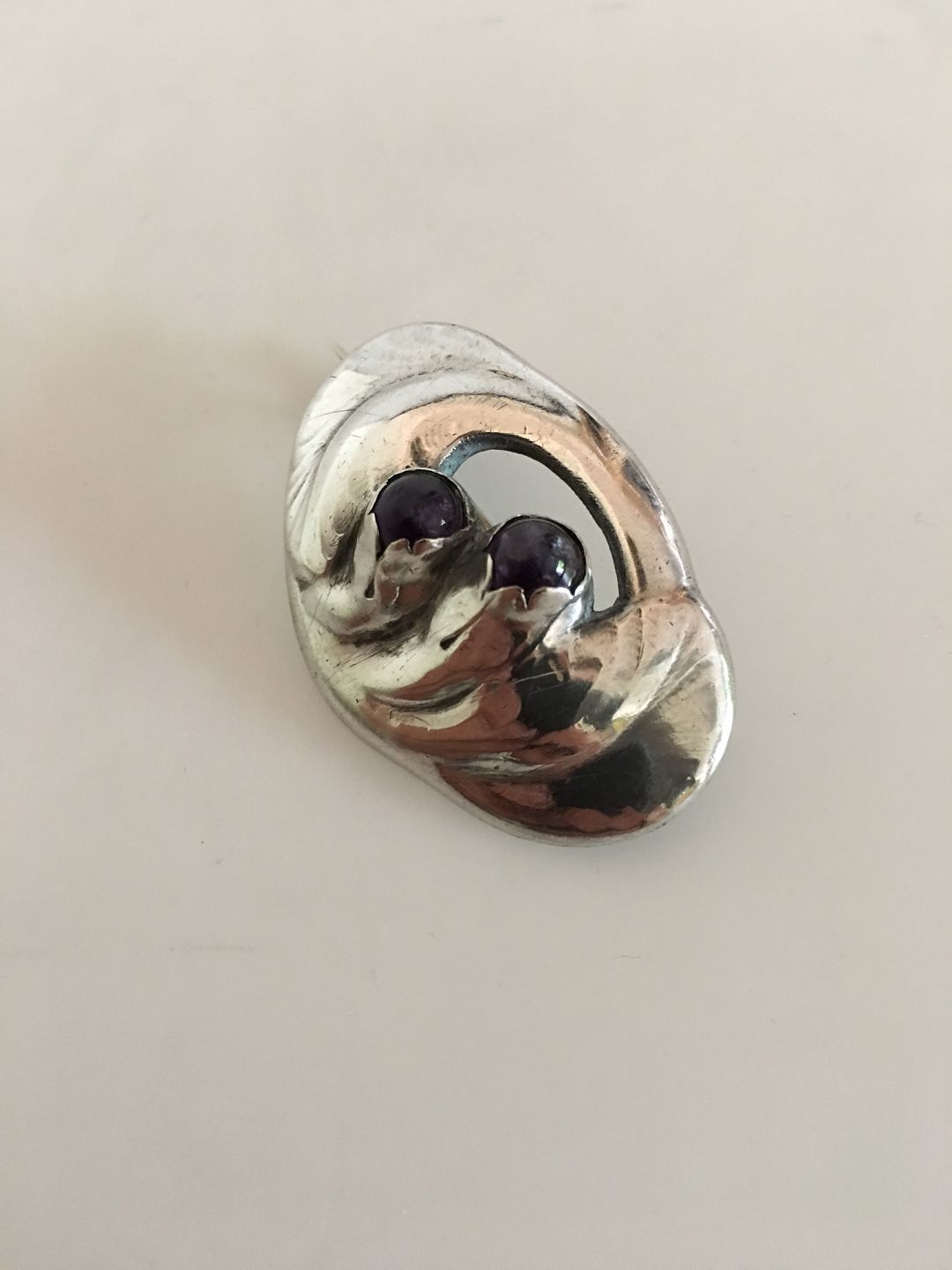 Evald Nielsen Silver Brooch with Ametyst. Measures 4 cm L (1 37/64"). The stones have some wear but otherwise in good condition. Weighs 9 grams.