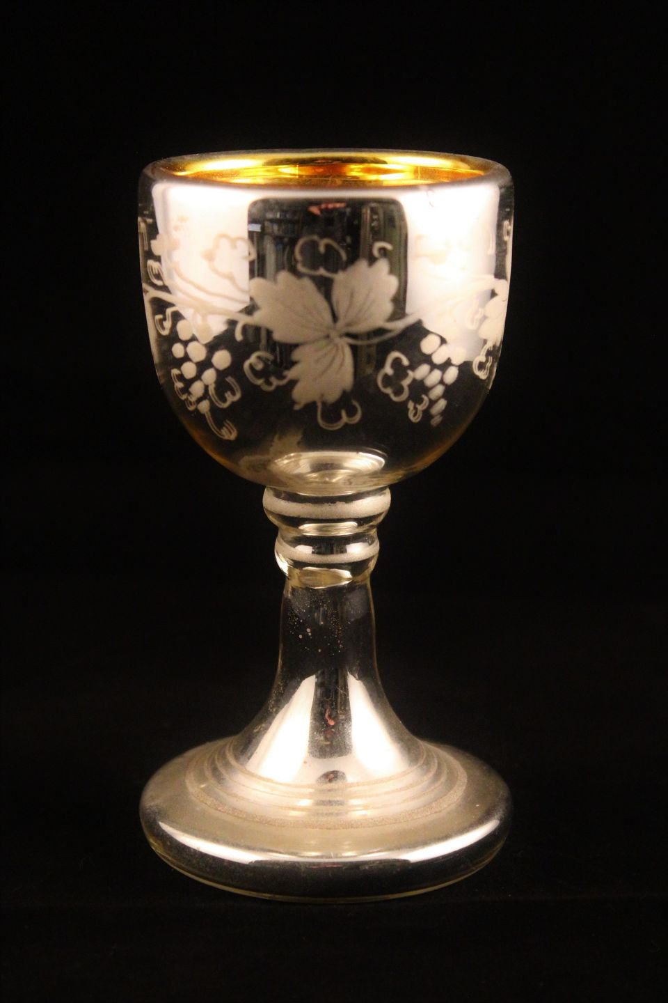 1800th century wine glass made of mercury glass, decorated with etched wine leaves outside.