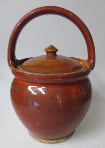 Maternity bucket, Funen, approx. 1900, Denmark. Brown glazed with lid and handle. Height: 23 cm.