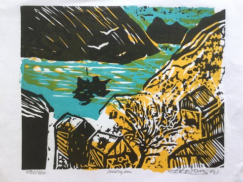 Text available in Danish: Farvetræsnit af Amariel Nordoy 1991 - Færøsk fjordparti.