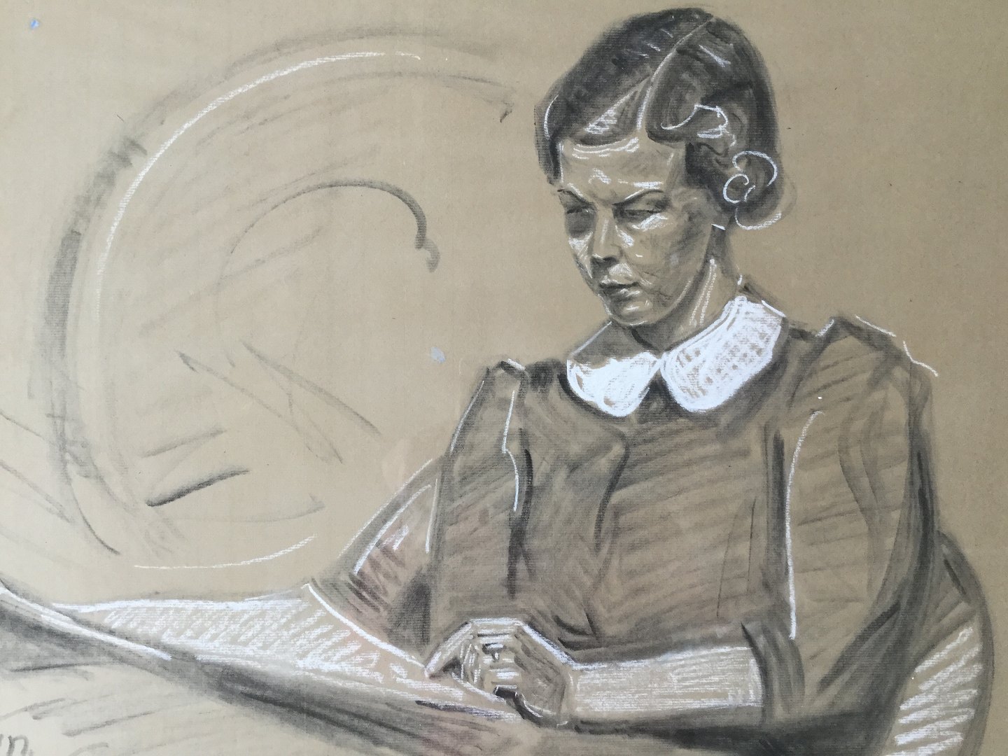 Tegning af H.J. Korn 1936 - Siddende og læsende kvinde.
