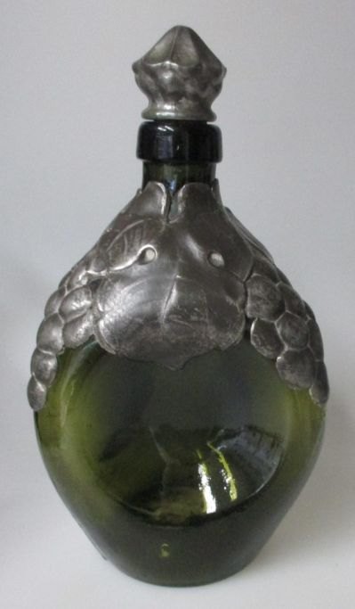 Green bottle with pewter decorations, 1920 - 1930, Denmark. Height: 23 cm.