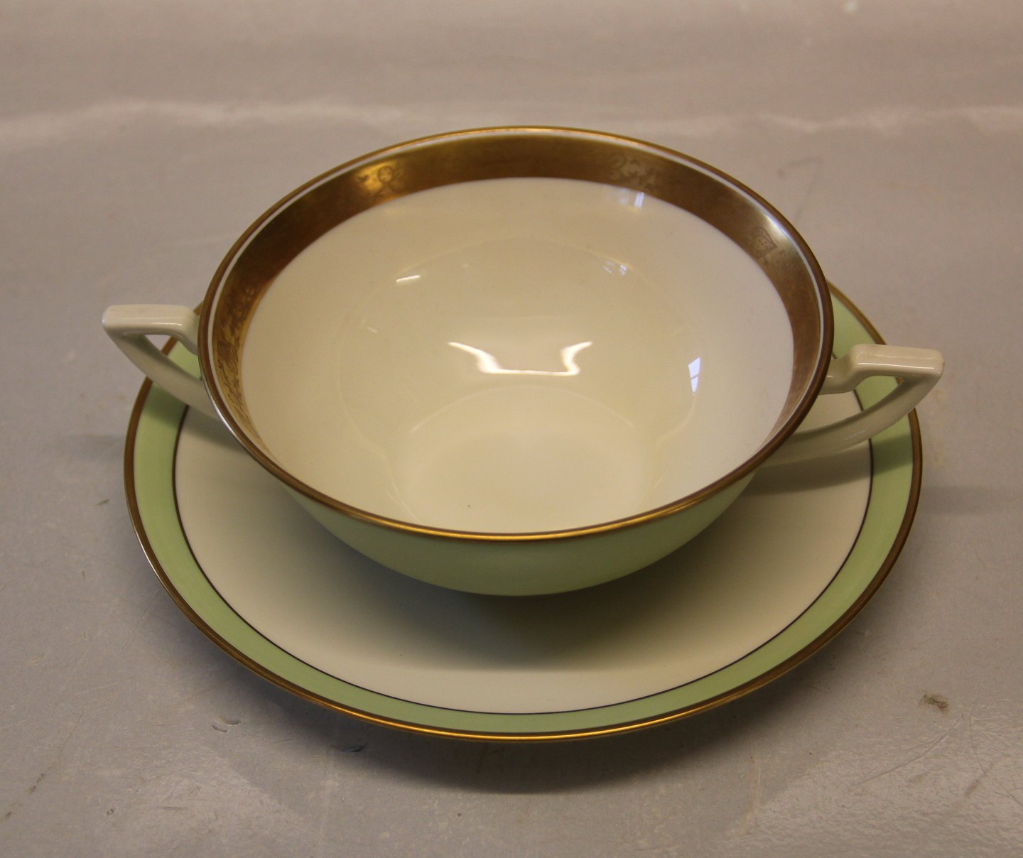 9571-988 Bouillon cup 18 cm with handles and saucer 17 cm Soup cup Royal Copenhagen Dagmar dinnerware. Green porcelain with wide goldrim. In nice and mint condition. Design Thorkild Olsen 1938