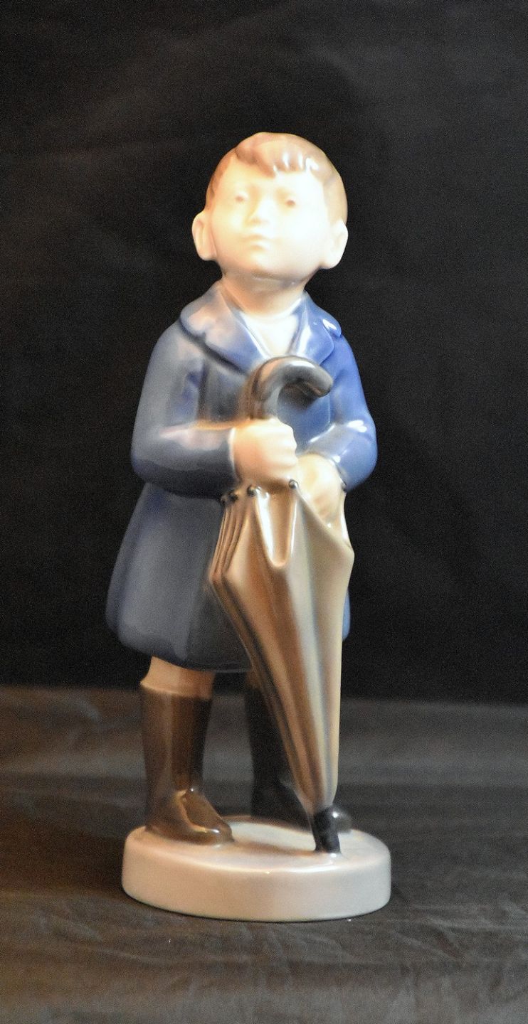 Text available in Danish: Royal Copenhagen dreng med paraply