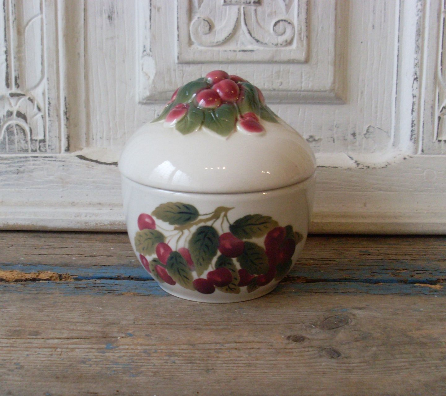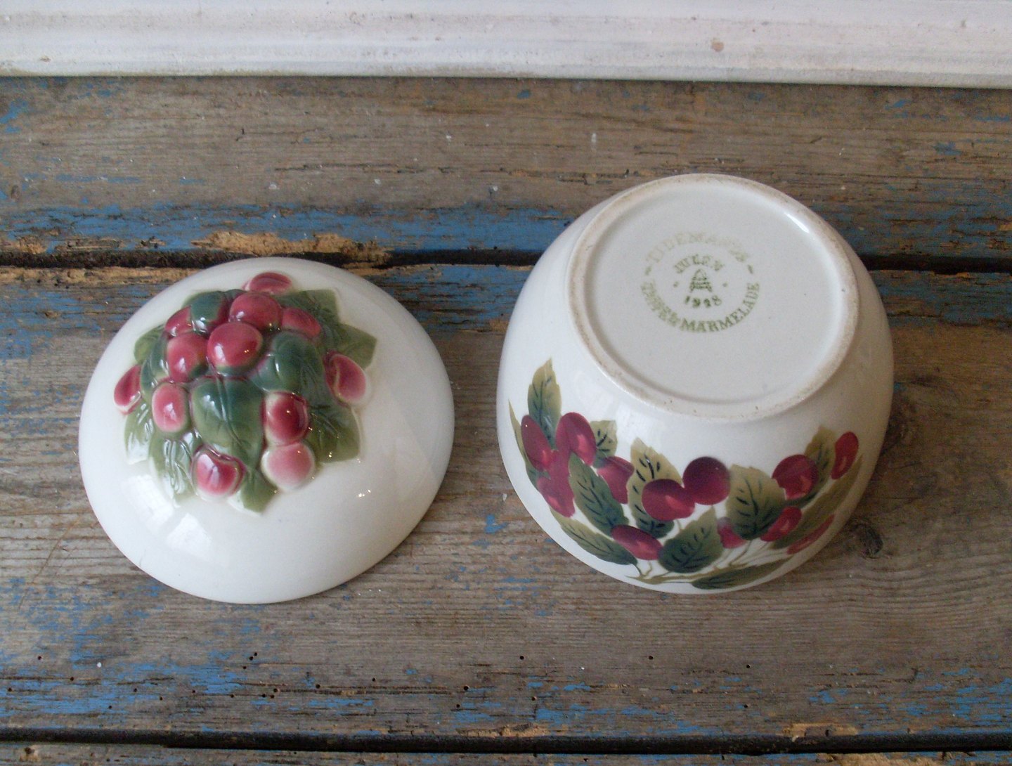 Aluminia marmeladekrukke dekoreret med røde irsebær fra 1928