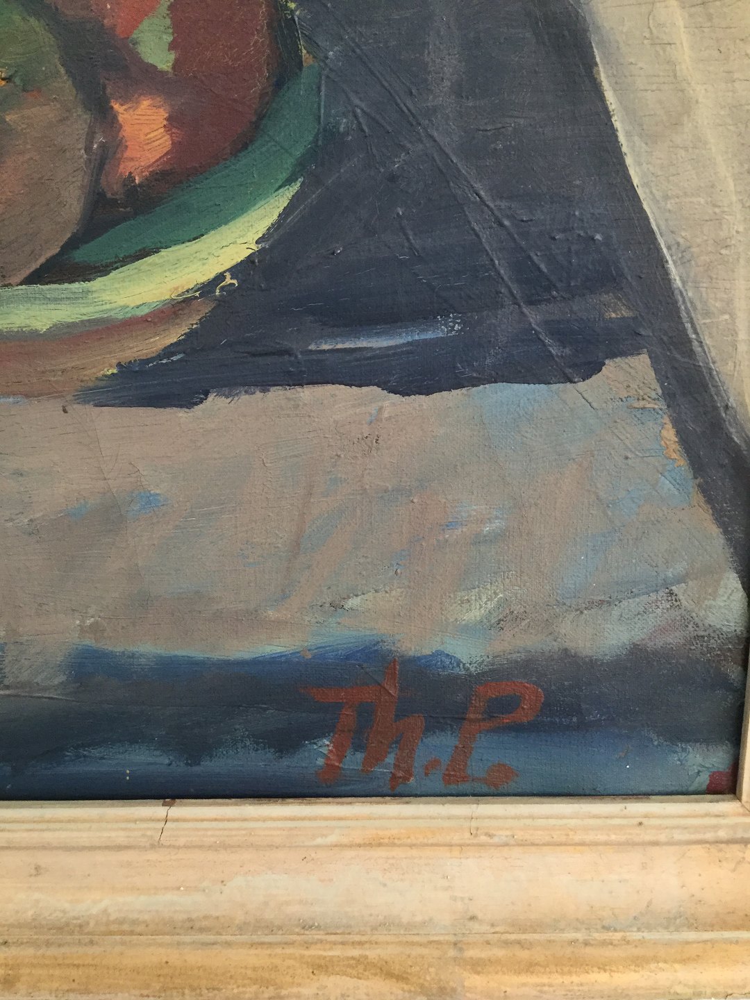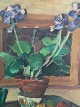 Text available in Danish: Maleri af Thorvald Petersen - Potteplante, glas og frugt på bord.
