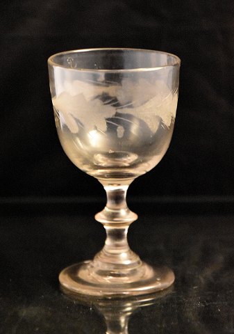 Et vinglas på cylindrisk stilk, med knap. Om kummen en matslebet 7-fliget egeløvsfrise med et agern, der mere er sat på en lige streg skiftevis op og ned. Mørkere glas end 330812