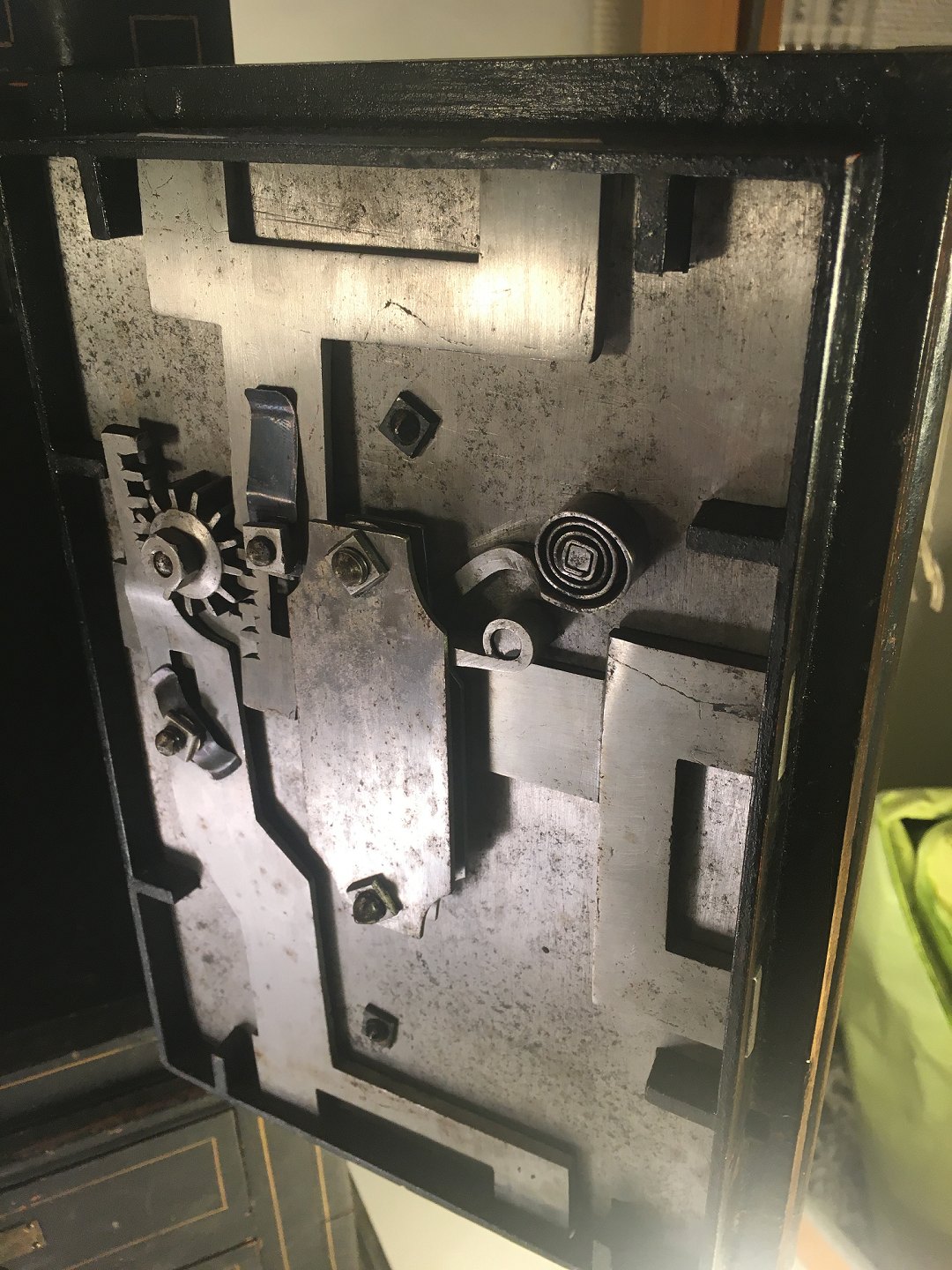Old unique safe in miniature. standing on wooden shelf. with 2 drawers.