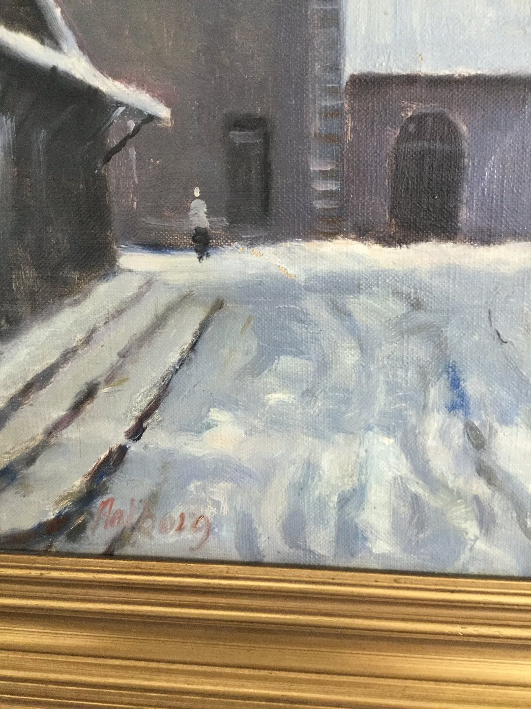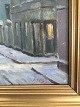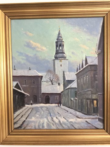 Text available in Danish: Maleri af Einar Gross - Vinterparti fra C.W. Obels Plads og Budolfi Kirke, Aalborg.