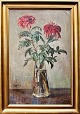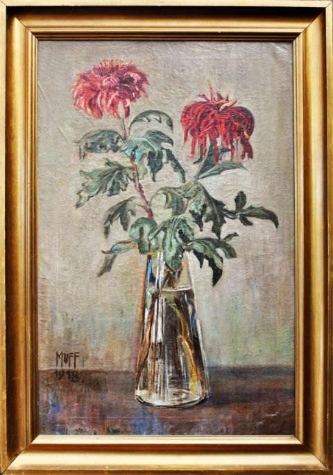 Muff, Orla (1903 - 1984). Display of flowers in a vase. Oil on canvas. Sign: Muff 1918. On the streacher label from Charlottenborg 1918, with the name: Orla Jacobsen Muff. 74 x 48 cm.