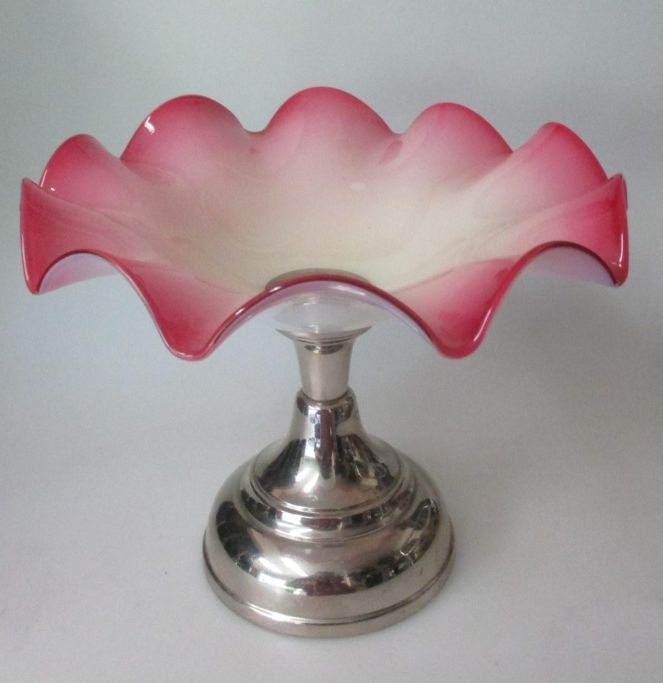 Bord skål i hvidt opal glas med lysrød flæset kant, ca. 1900. Tyskland. På fod af nikkel. Højde.: 17,5 cm. Dia.: 22 cm.