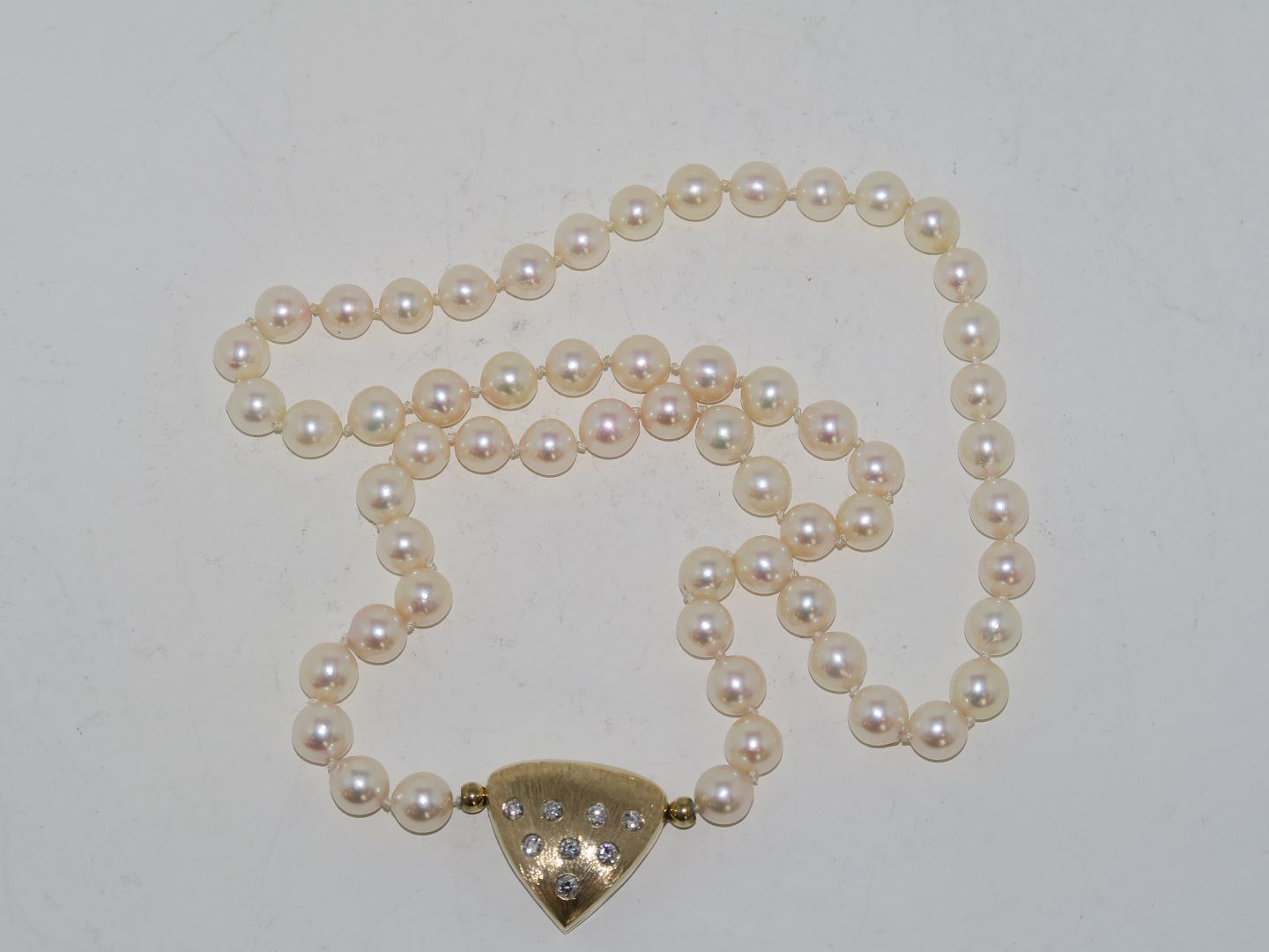 Pearl necklace with 14 carat gold pendant with 8 diamonds