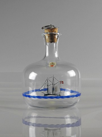Glasflasken har dekoration af skib og måger. Flasken kommer med korkprop.