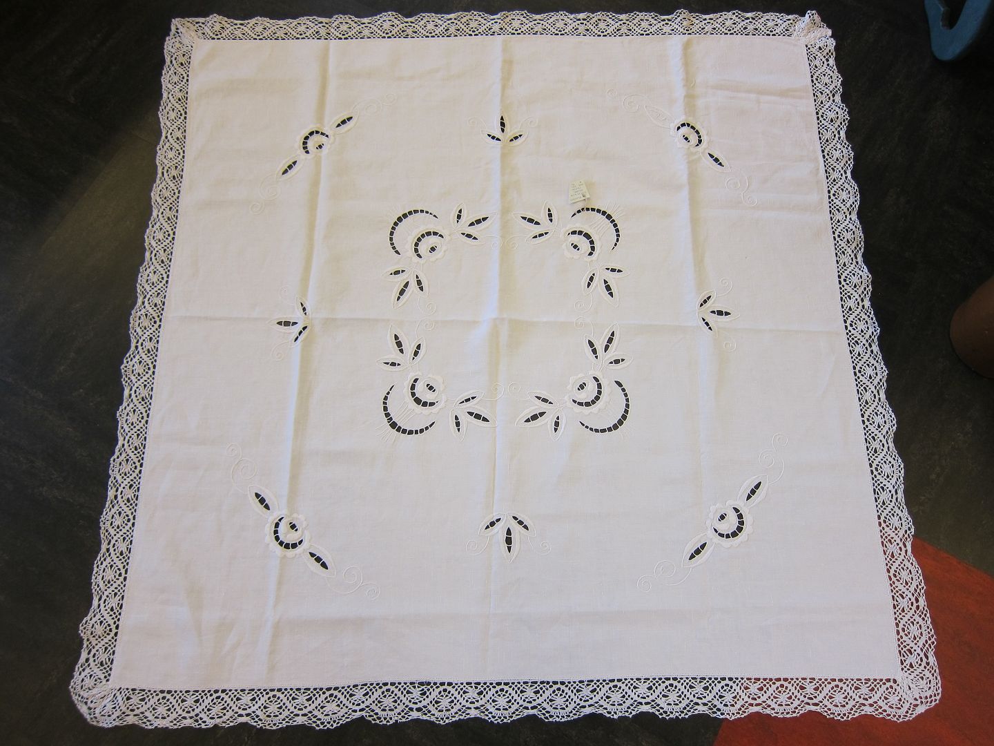 Table cloth with embroidery made by hand and a crocketed edge also made by hand
