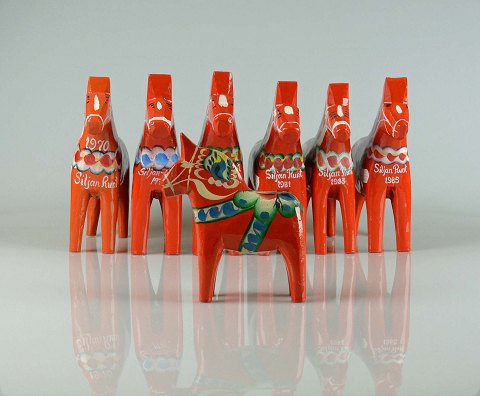 Dalar figurer i træ med motiv af Dalar heste i rødmalet træ med dekoration