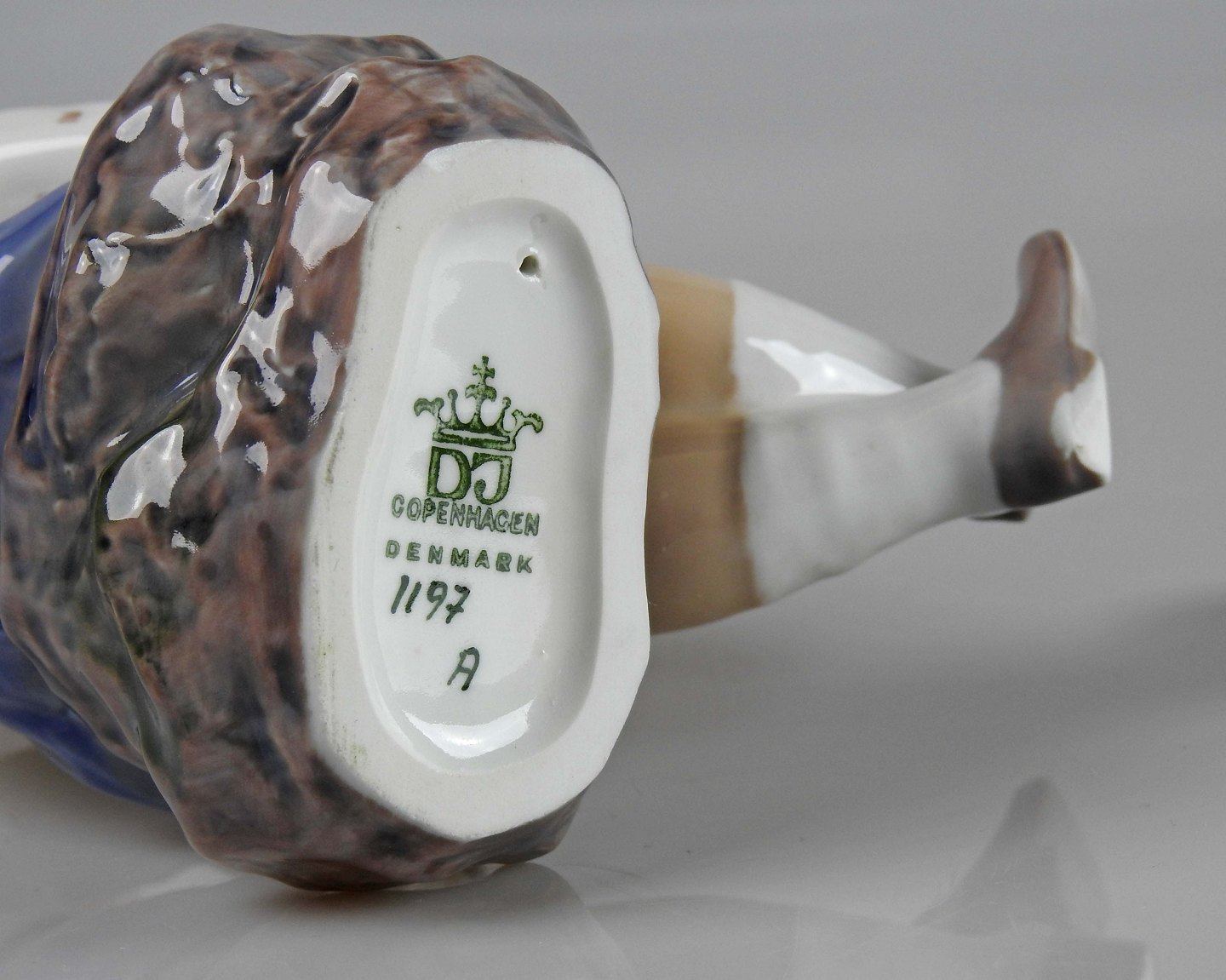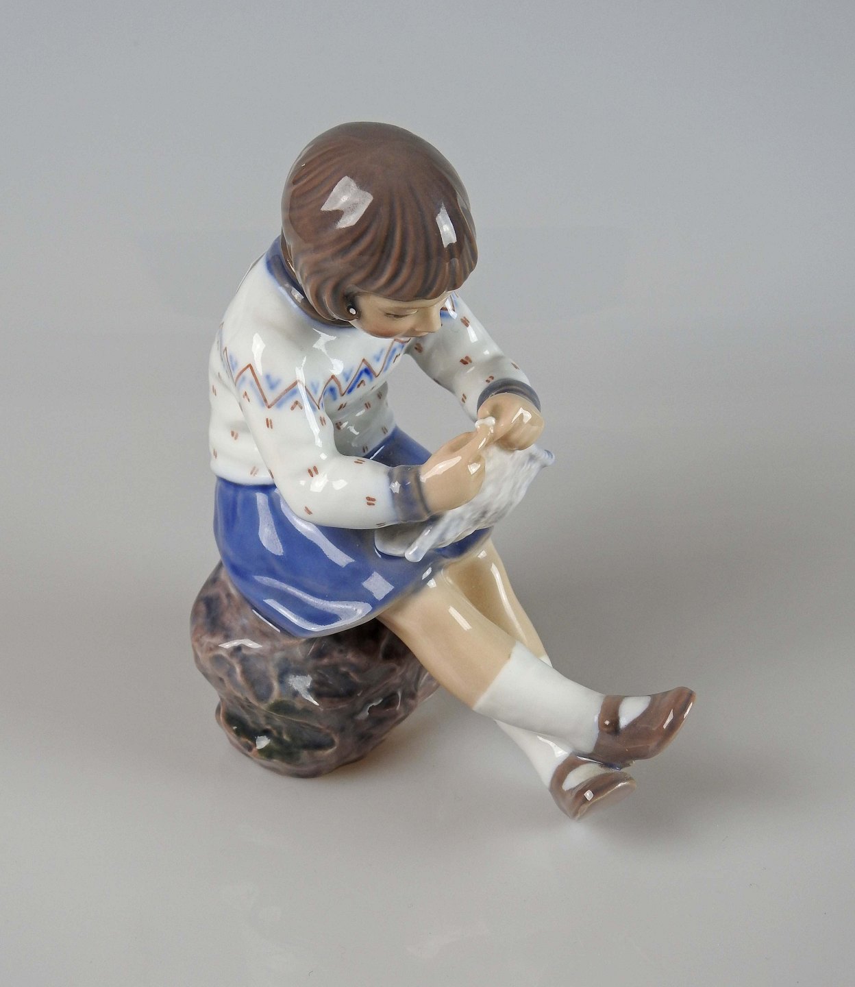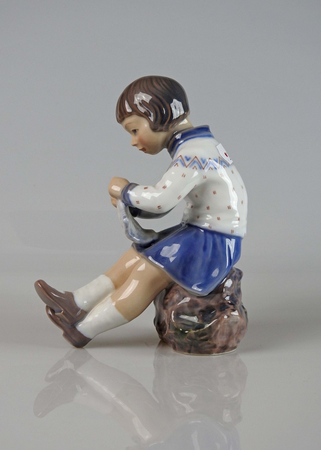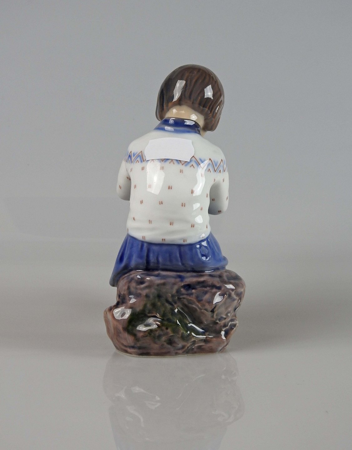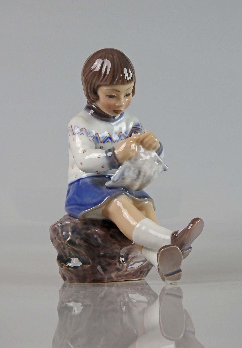 Figur af strikkende pige i blå kjole og strikketrøje siddende på sten af Dahl Jensen nr. 1197