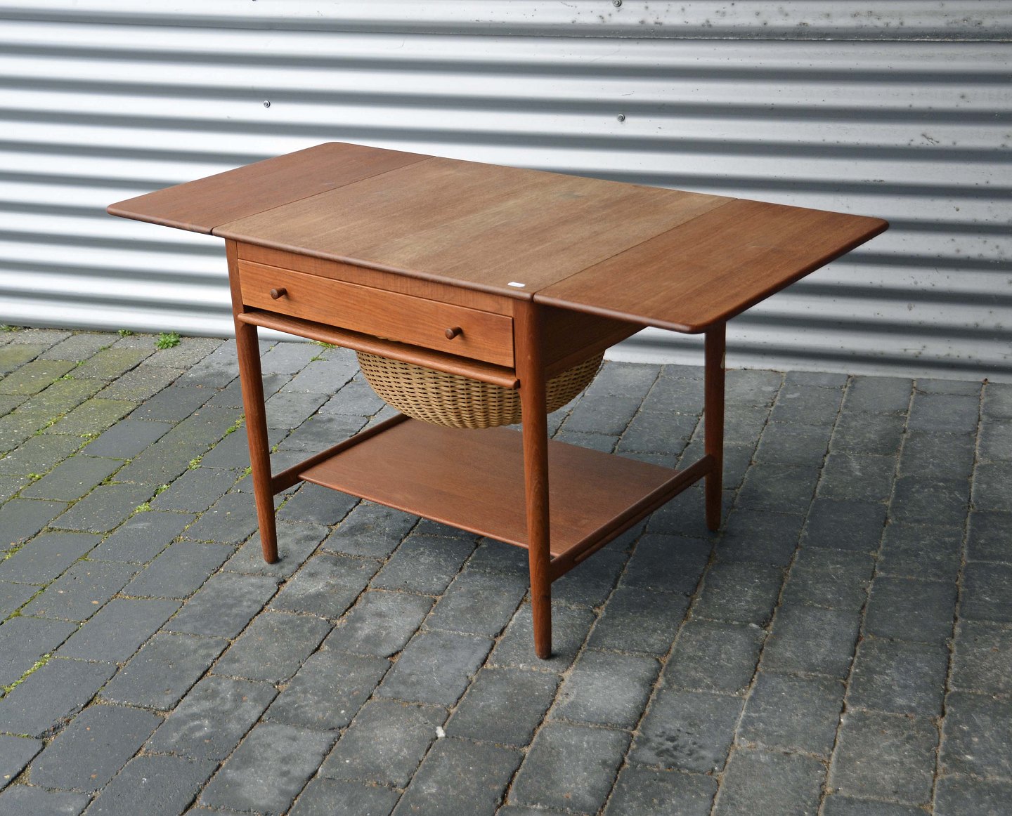 Sybord i teak, designet af Hans J Wegner. Alt er i teak på nær det indvendige af skuffen.