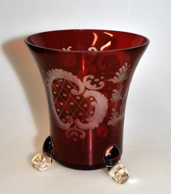 Bamboo vase, 20th century. Clear glass with red overlay. With grinding in the form of rocailler and pavillion. On three legs. H: 11 cm.