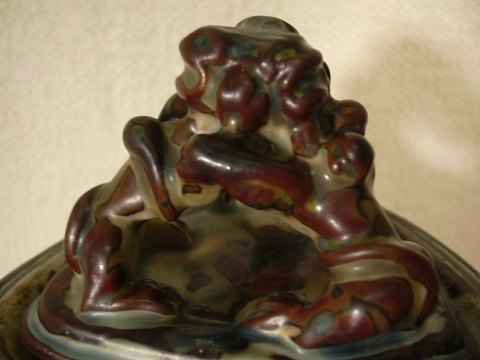 Lid Pot Royal Copenhagen No 20160 Height: 20 cm Bode Willumsen lid pot. performed with relief decorations on the sides and covered with sung glaze. The vase is signed by BW's monogram printed into the bottom. perfect condition.