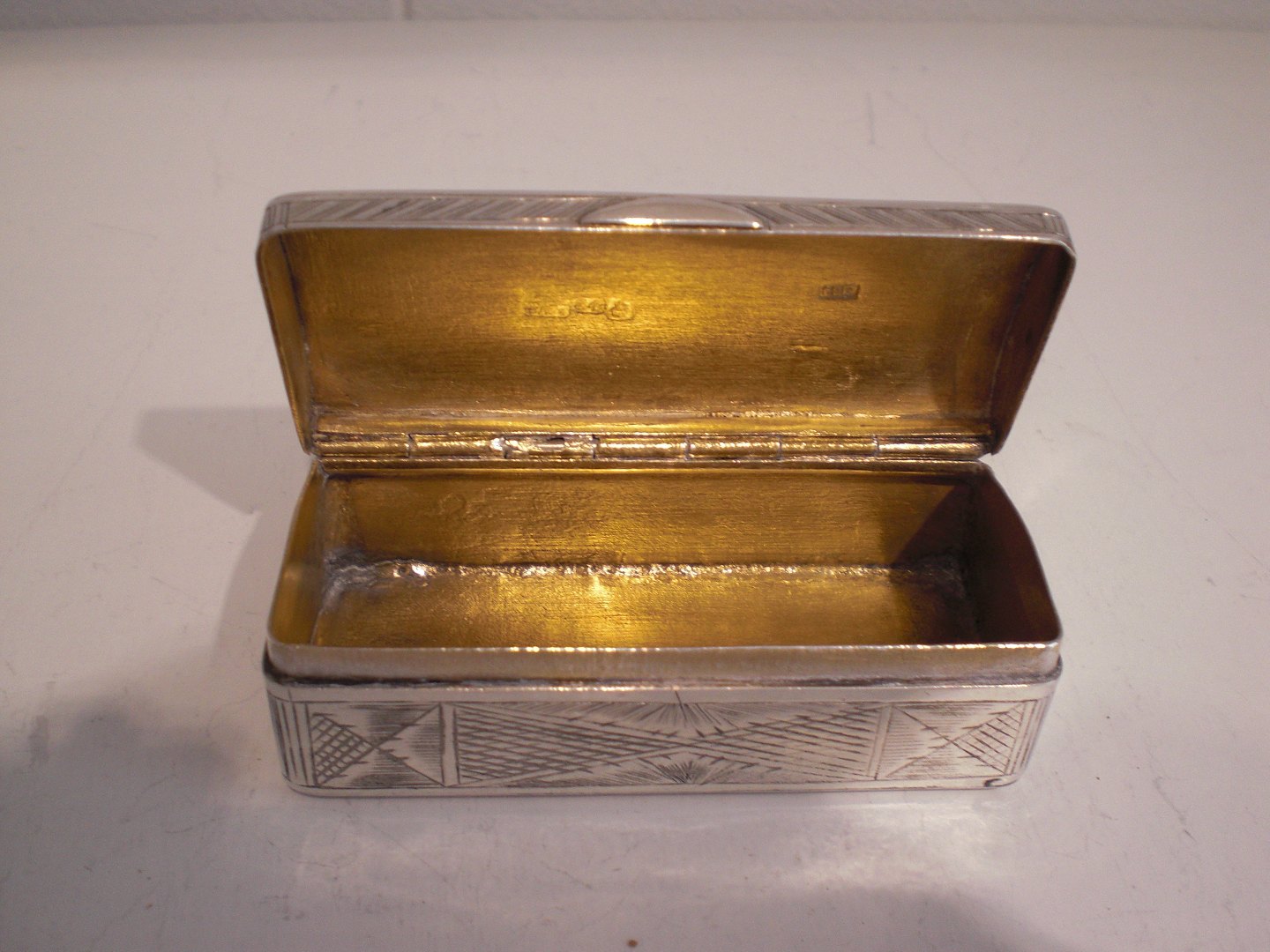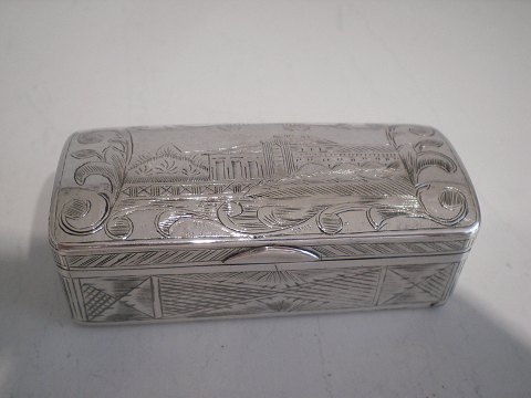 Text available in Danish: Vægtig russisk aflang sølvdåse (84 =0,875 sølv) fra 1858 - med svagt tydeligt mesterstempel, guareinstempel, lødighedsstempel og årstal i både låg og bund. Muligvis Ivan Vasileyvich Avdeyv, Moskva 1852 - 1862. Rundet låg, bygnings motiver i låg og bund og ornamentik på siderne. Gammel reparation i bud ellers tidstypisk brugsslid. Vægt: 72 gram. Mål: 7,3 x 3,3 x 2,5 cm.