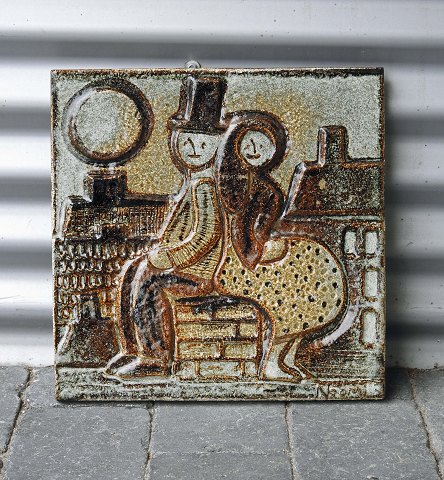 Relief i keramik med motiv af mand og kvinde på skorsten nr. 3586