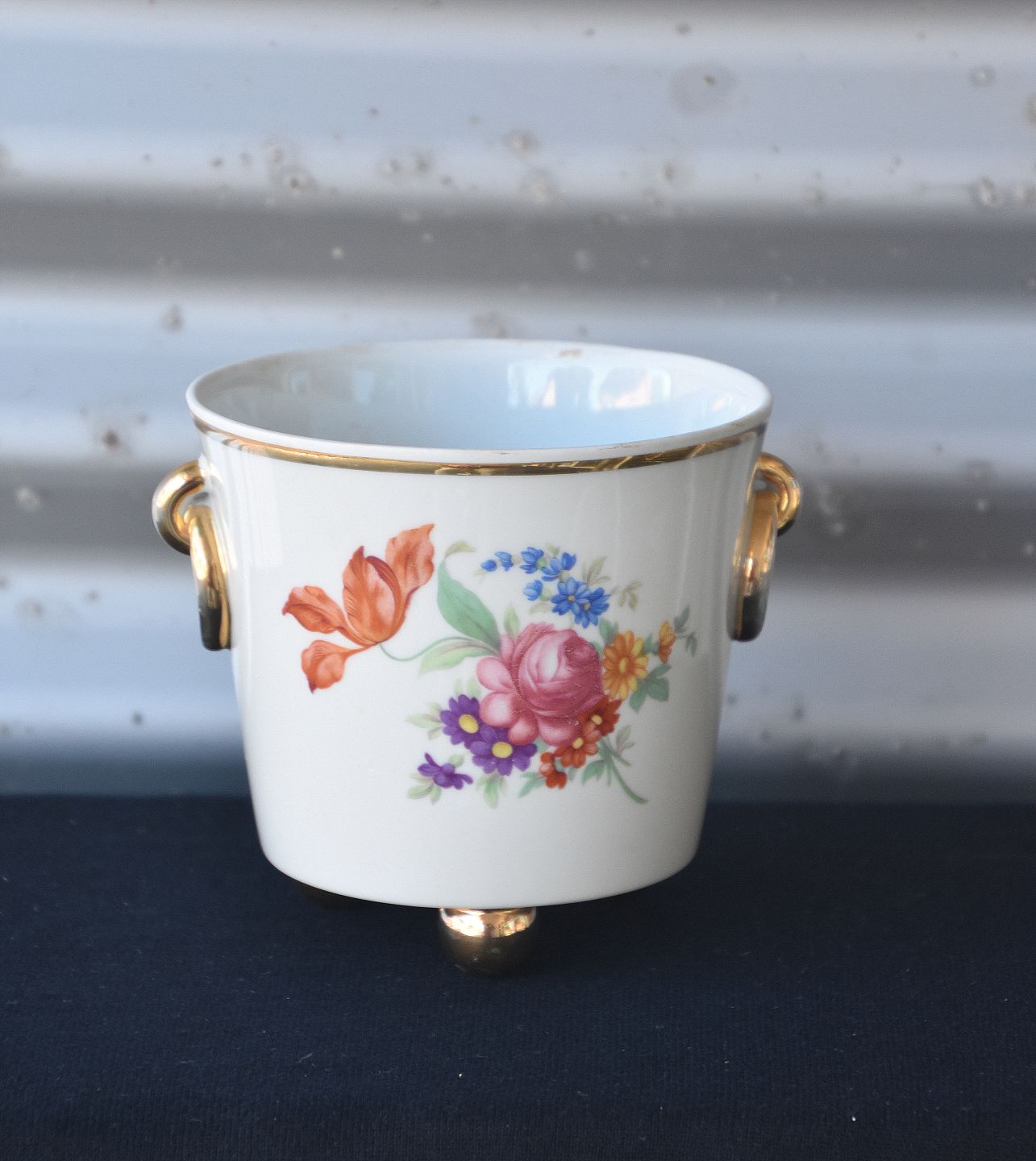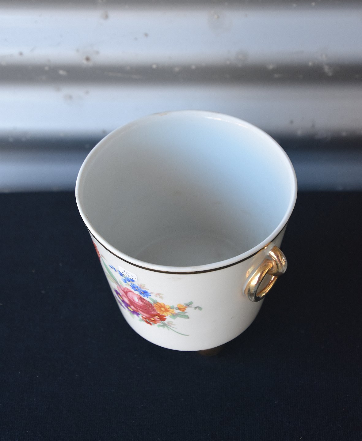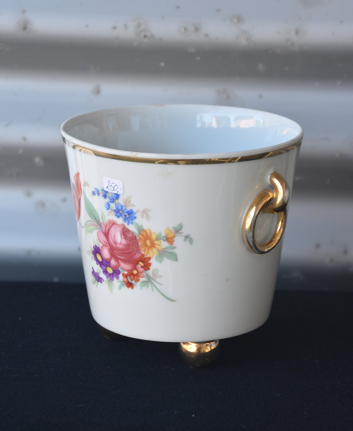 Urtepotte på guld kugle fødder. Urtepotteskjuleren er dekoreret med blomstermotiv i overførselsteknik, samt delvis forgyldning