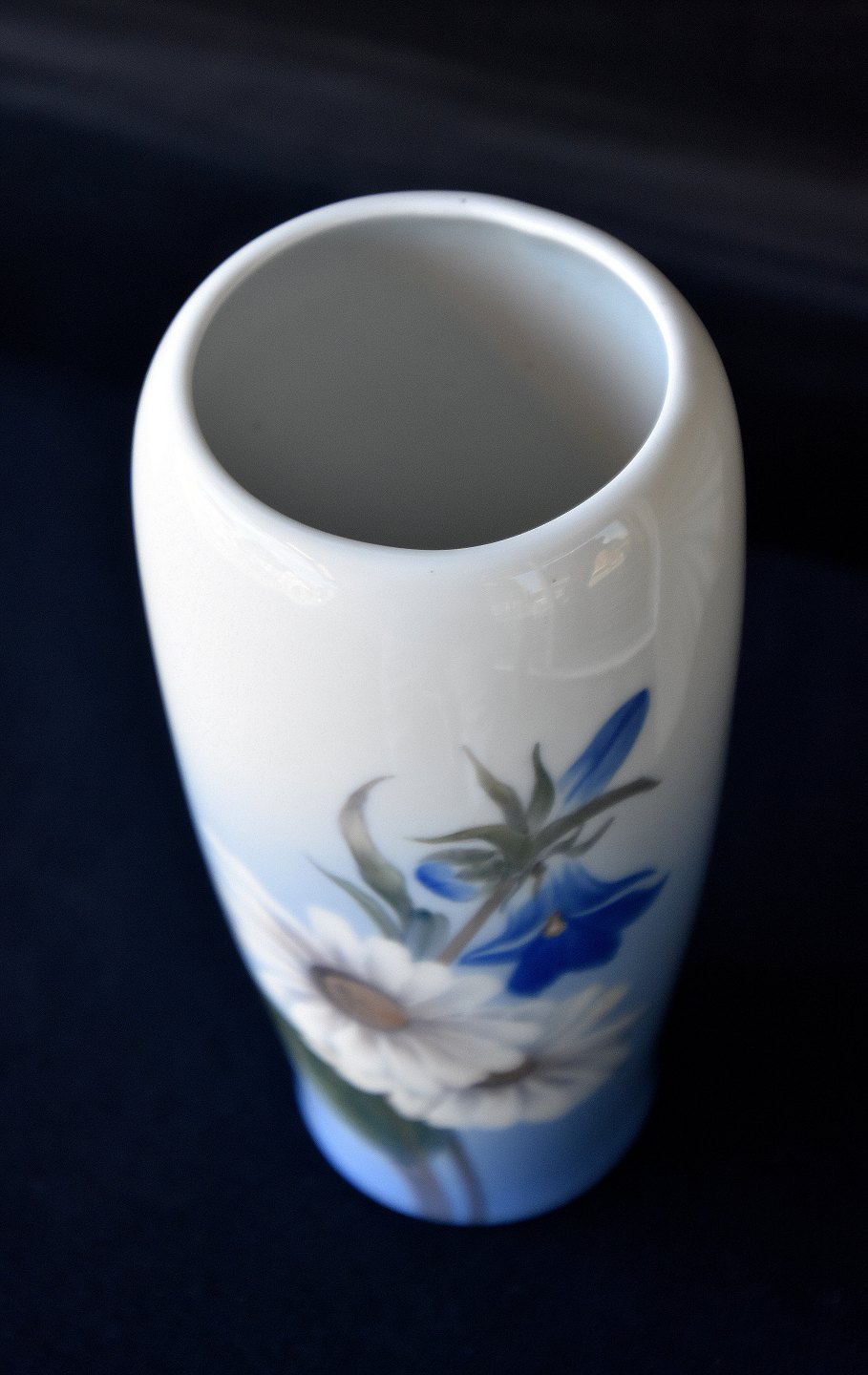 Royal Copenhagen vase, 2651/235, dekoreret med hvide margueritter og blå klokkeblomster.