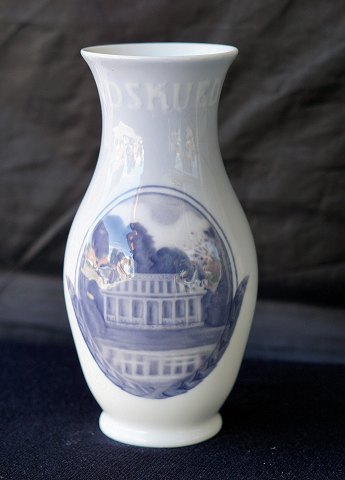 Text available in Danish: Royal Copenhagen, Rundskuevase 1923. Motivet på vasen er Den kinesiske pavillon i Frederiksborg Have, bagpå er der dekoreret med en blomster ranke