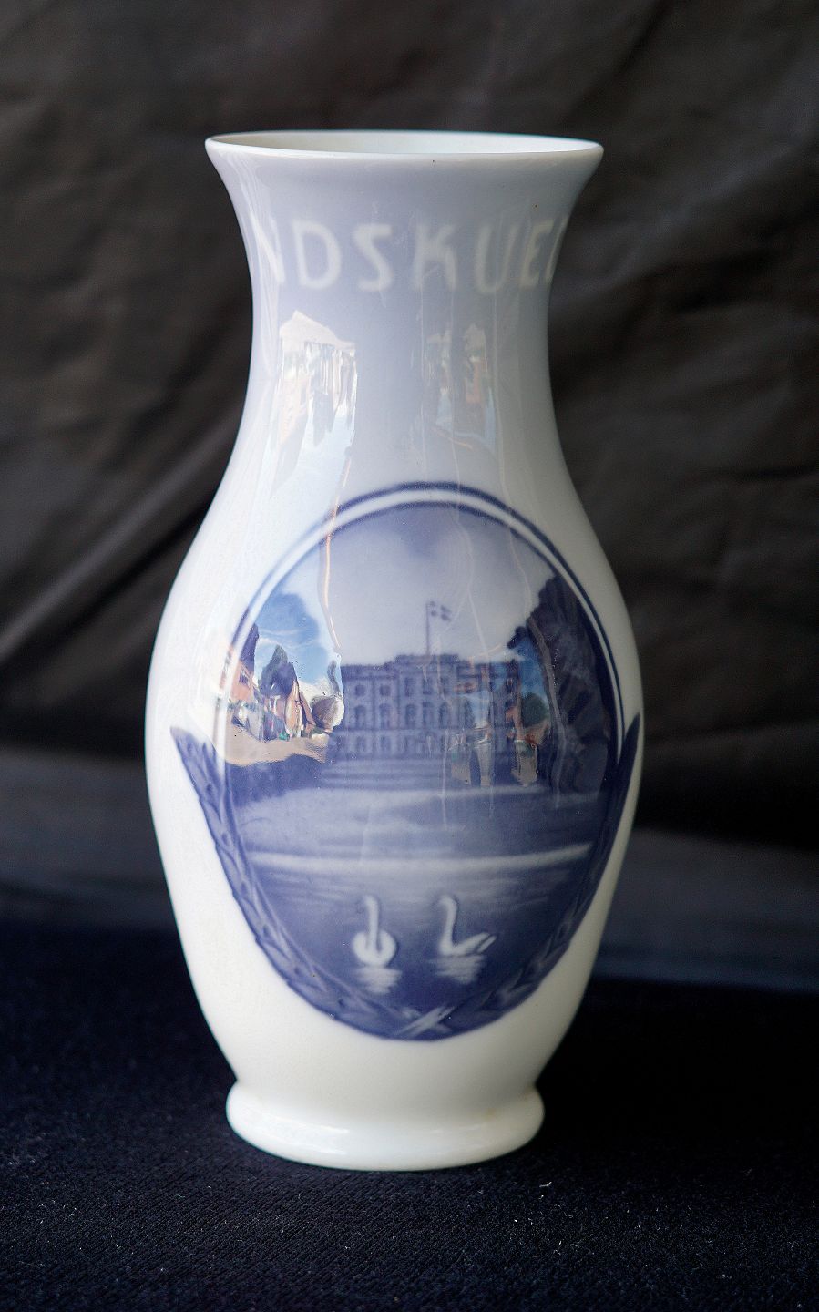 Text available in Danish: Royal Copenhagen, vase 178, Rundskuevase 1924. Motiv på vasen er Frederiksborg Slot